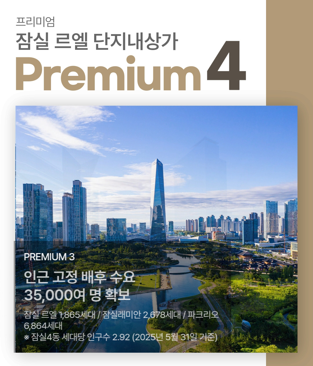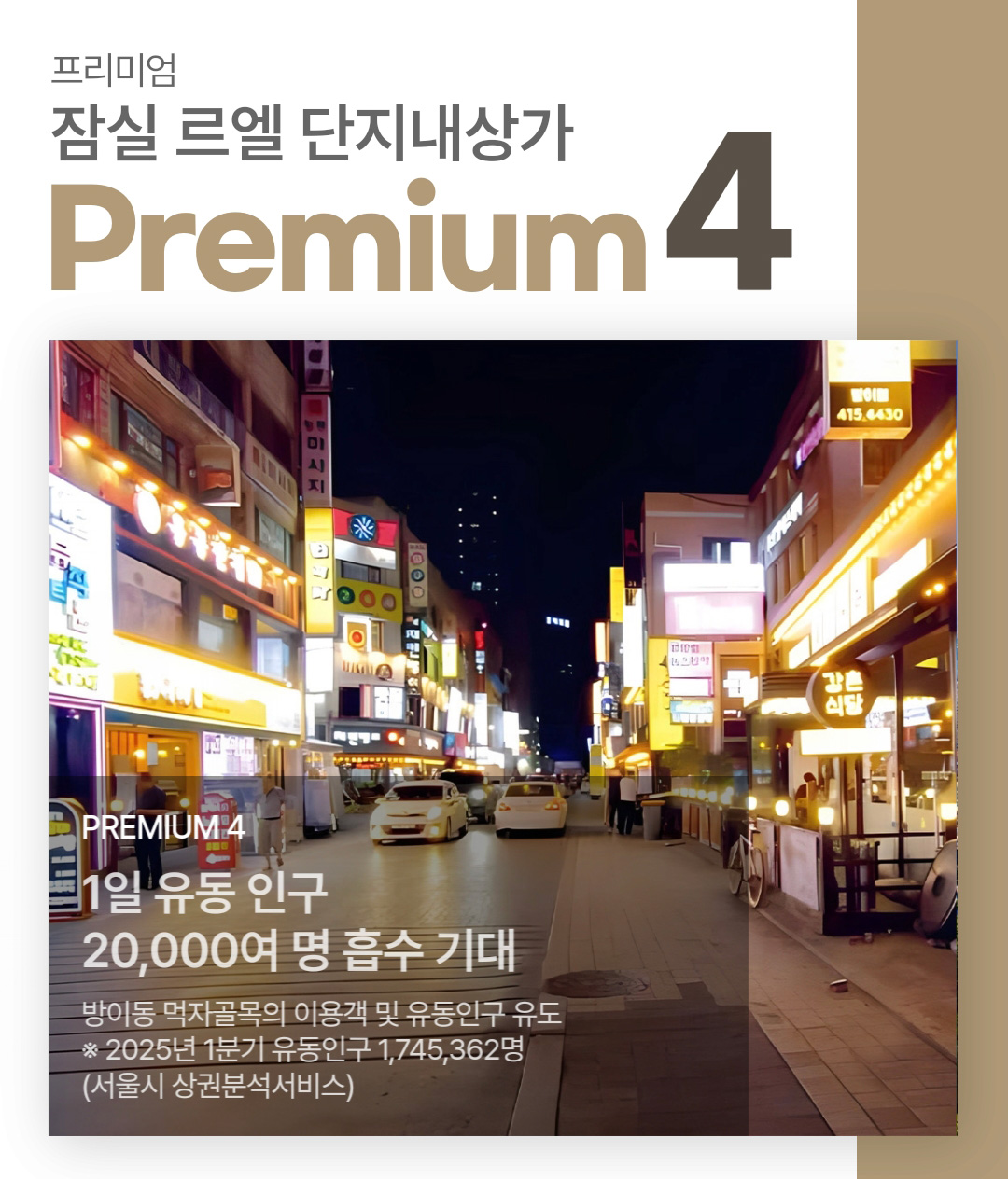 상가 지하 1층과 연결지하철 이용 수요의 Gateway 역할로 유동 인구 흡입 효과PREMIUM 1잠실역 지하보도와4,000여 명의 직원 수요송파구청 1,783명 / 수협중앙회 1,724명PREMIUM 2송파구청 등 35,000여 명 확보※ 잠실4동 세대당 인구수 2.92 (2025년 5월 31일 기준) 잠실 르엘 1,865세대 / 잠실래미안 2,678세대 / 파크리오 6,864세대 PREMIUM 3인근 고정 배후 수요20,000여 명 흡수 기대※ 2025년 1분기 유동인구 1,745,362명 방이동 먹자골목의 이용객 및 유동인구 유도 PREMIUM 41일 유동 인구